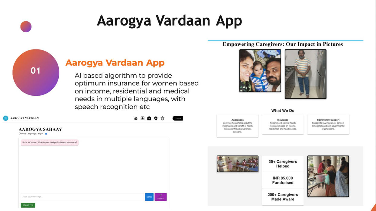When Shubh’s house help fell into major debt after a family member’s accident due to lack of insurance, he saw the urgent need for accessible financial guidance. This led him to design Aarogya Vardaan, a voice-enabled, multilingual AI system that helps household workers find suitable insurance plans. Using natural language processing (NLP), it allows users to ask questions in their preferred language, simplifying policy comparisons and providing personalized recommendations, ensuring financial security is within reach for all.